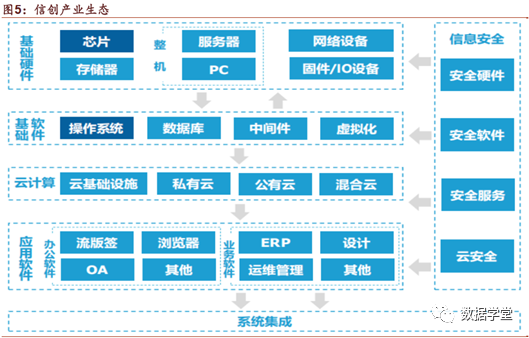 我国信创软硬件生态已初步建立。信创产业生态主要由底层硬件、基础软件、平台软件、应用软件、信息安全组成。