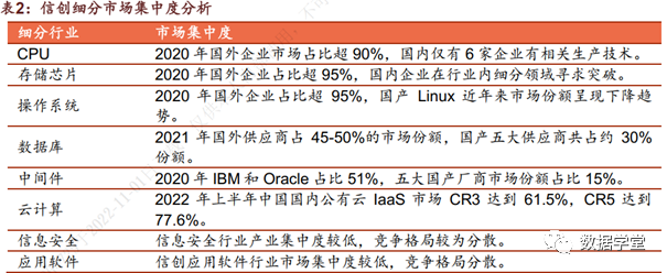 信创产业不同细分行业市场集中度差异较大。其中CPU、存储芯片和操作系统领域市场基本处于国外企业寡头竞争格局,市场集中度较高。云计算领域国产化程度较高,呈现国产企业寡头竞争格局;数据库和中间件领域市场集中度中等偏高;信息安全和应用软件领域细分行业参与竞争企业较多,市场集中度相对较低。