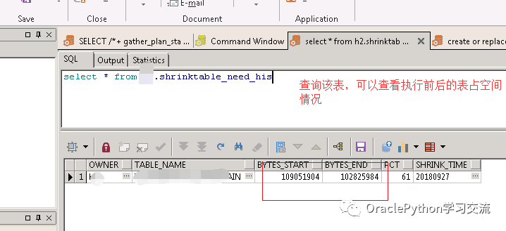 for i in (select owner||'.'||table_name as tablename,t.* from (select * from (select owner,table_name,bytes as bytes_start,0 as bytes_end,pct from v_shrinktable b order by bytes_start) a where rownum=1) t )