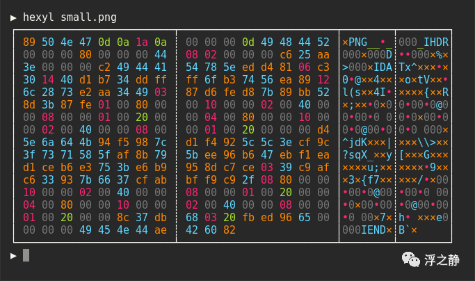 hexyl[27] - 是一个简单的终端十六进制查看器。它使用彩色输出来区分不同类别的字节(NULL 字节、可打印的 ASCII 字符、ASCII 空白字符、其他 ASCII 字符和非 ASCII)。