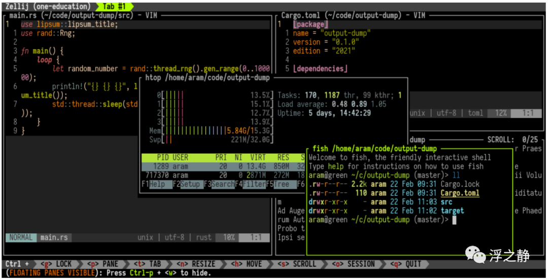 zellij[28] - 是一个面向开发人员、面向运维的人员和任何喜欢终端的人的工作区。它的核心是一个终端多路复用器(类似于 tmux[29] 和 screen[30]),但这仅仅是它的基础设施层。
