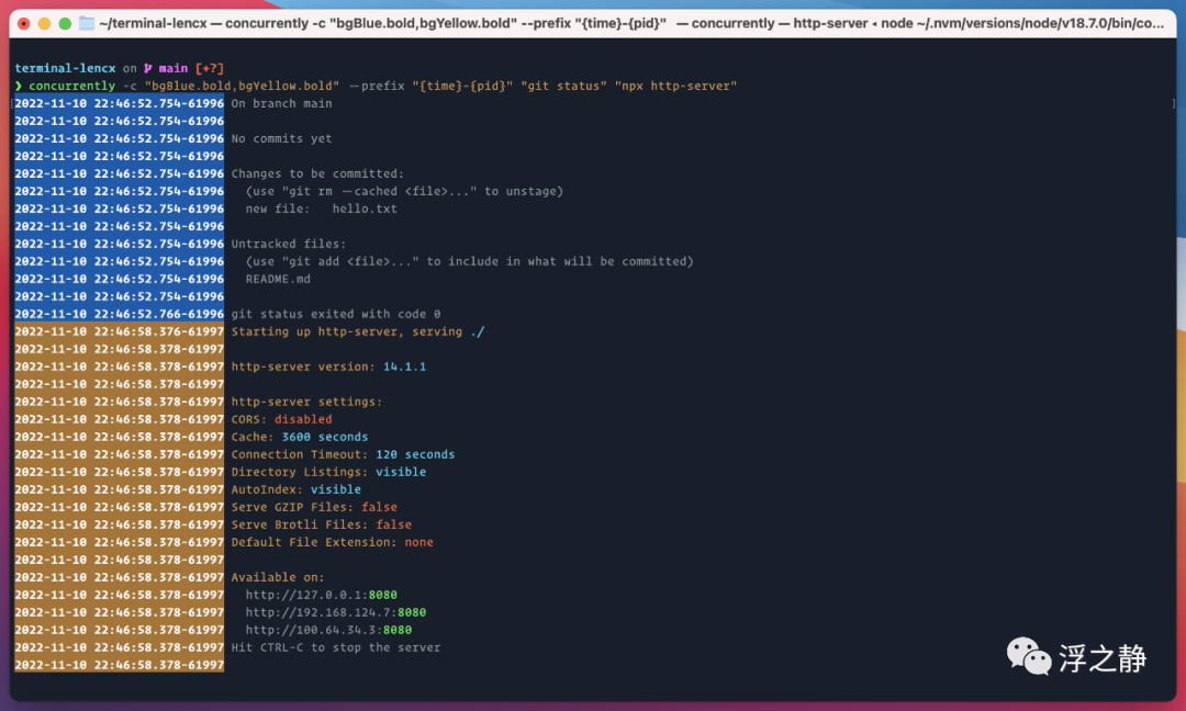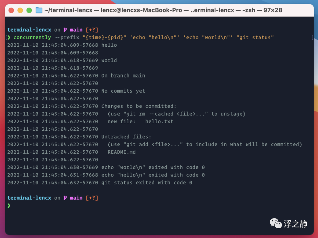 concurrently --prefix "{time}-{pid}" 'echo "hello\n"' 'echo "world\n"' "git status"