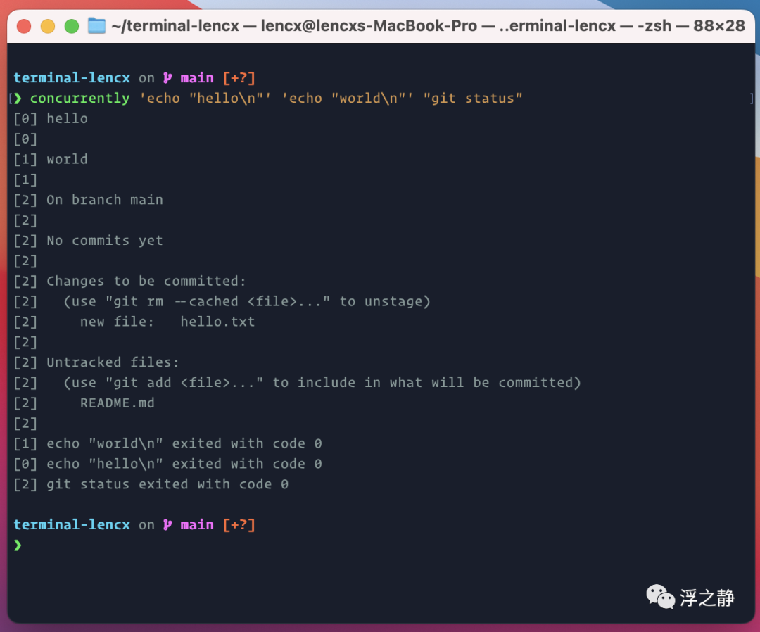 concurrently 'echo "hello\n"' 'echo "world\n"' "git status"