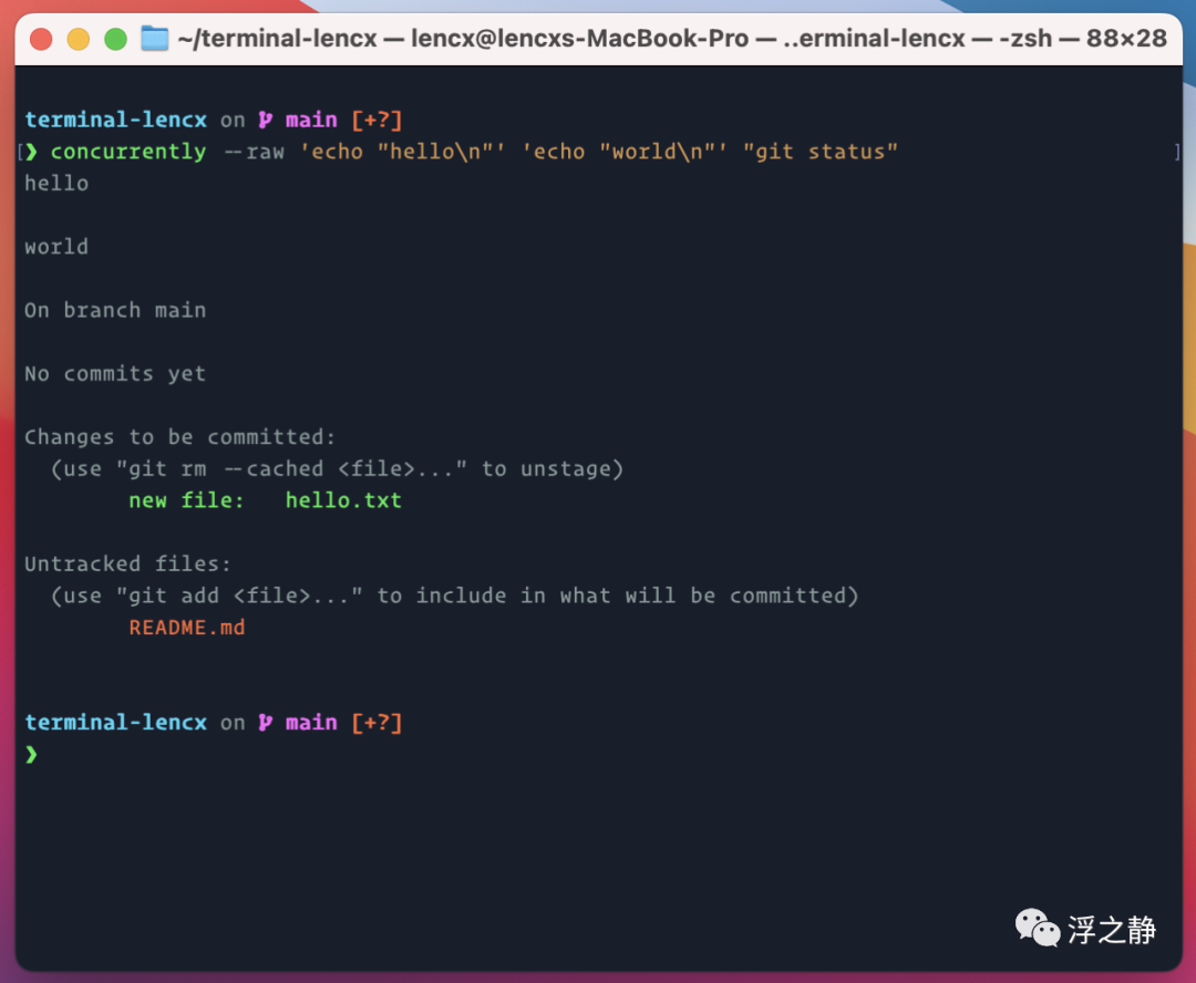 concurrently --raw 'echo "hello\n"' 'echo "world\n"' "git status"