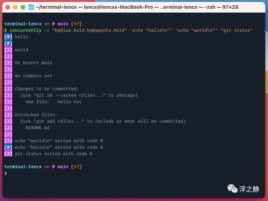 concurrently -c "bgBlue.bold,bgMagenta.bold" 'echo "hello\n"' 'echo "world\n"' "git status"
