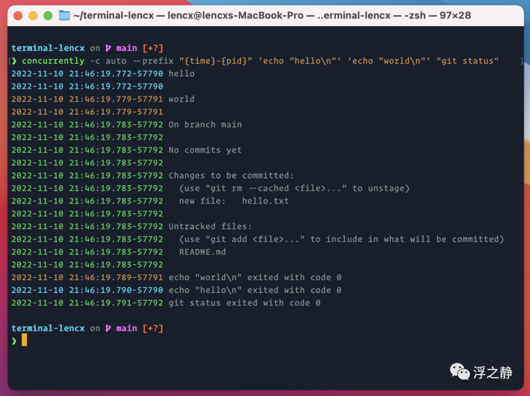 concurrently -c auto --prefix "{time}-{pid}" 'echo "hello\n"' 'echo "world\n"' "git status"