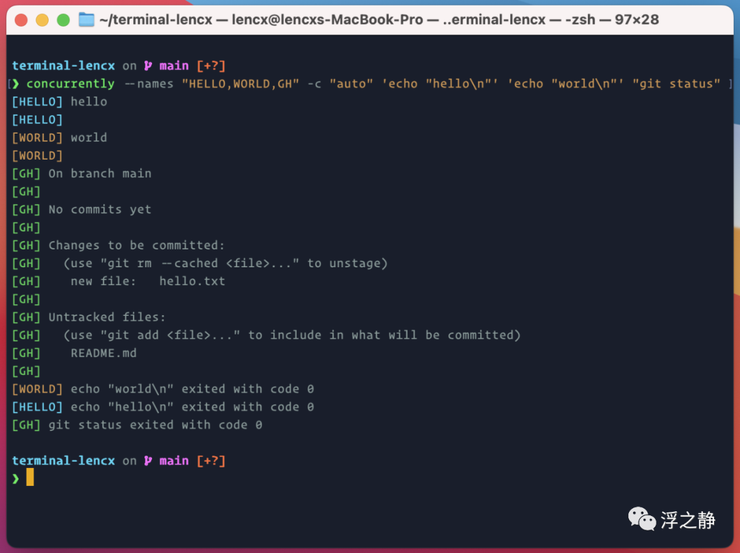 concurrently --names "HELLO,WORLD,GH" -c "auto" 'echo "hello\n"' 'echo "world\n"' "git status"