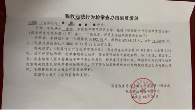 近日,举报人提供的材料显示,济南市税务局第一稽查局称李静于稽查立案前申报缴纳了印花税13947.5元,个人所得税2237459.4元,滞纳金1136180.53元。经税务局立案检查,李静本次应补缴个人所得税88492.6元,滞纳金52847.33元,合计141366.93元。