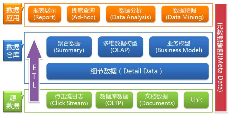 数据仓库的输入方是各种各样的数据源,最终的输出用于企业的数据分析、数据挖掘、数据报表等方向,支撑企业决策