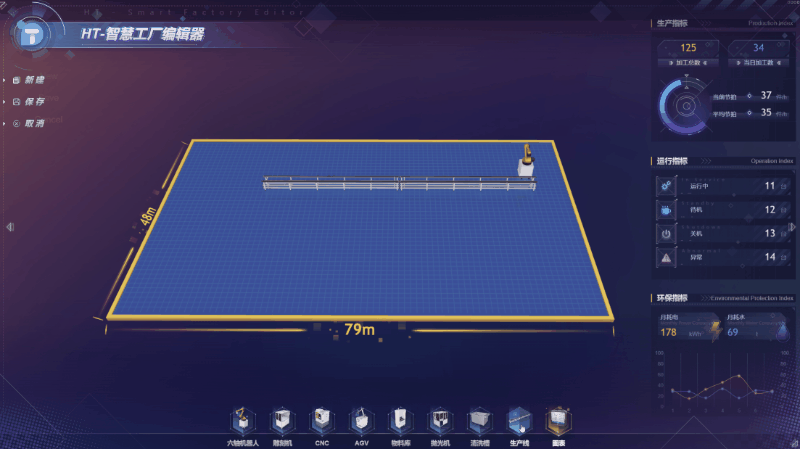 示例模型包含六轴机器人、雕刻机、CNC、AGV、物料库、抛光机、清洗槽、生产线。每个模型可进行参数设置,如名称、长度、宽度、高度、染色等,还能进行旋转和删除,模型位置可自由移动。编辑器采用积木式结构,用户只需要简单地组合,便可灵活地搭建车间内产品生产工艺流程。
