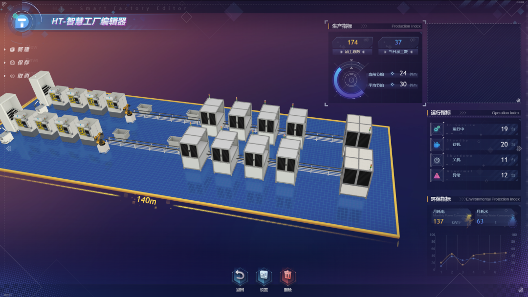 图扑智慧工厂编辑器内图表包含生产指标、运行指标、环保指标三个按钮,点击可弹出相应图表框,可自由移动位置。为图表接入数据后能查看工厂的产品生产数量、设备运行数据、二氧化碳排放量等信息,还能设置刷新速度。通过记录物料使用时间、加工进度、能源消耗等信息,给车间管理人员提供定单和计划完成情况的分析;还可以把物料消耗、人力成本通过财务体系融合进来,及时归集整个车间的运营成本。