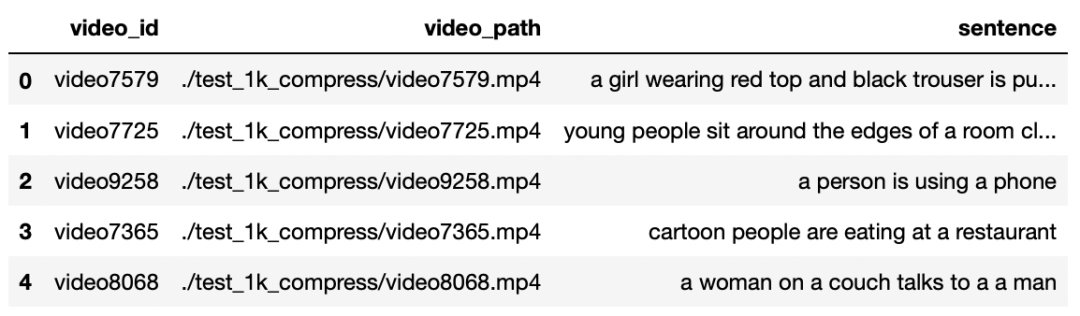 test_1k_compress: MSR-VTT-1kA 数据集中 1000 个压缩的测试视频。 MSRVTT_JSFUSION_test.csv: 一个 csv 文件,其中重要信息包括每个视频的id(video_id)、视频路径(video_path)、文字描述(sentence)。