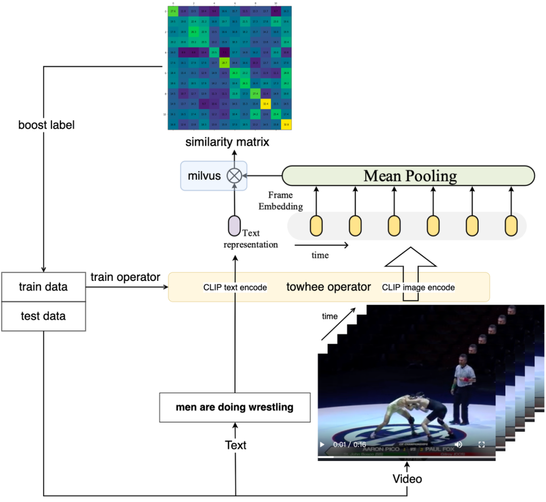 为了将视频与文本转换成向量,我们需要一个视频-文本跨模态的神经网络模型用于提取特征。Towhee 提供了一系列简单又好用的 API[12] ,以供我们可以更便捷地操作数据处理的算子和流水线。这里我们选用了 towhee clip4clip[13] 算子将视频库里的所有视频转换成向量,并插入事先准备好的 Milvus 集合中。该算子不仅提供了预训练的 CLIP4Clip[14] 提取特征,还包含了后处理工作(比如池化、维度处理、转数据格式),能够通过几行代码轻松提取向量。