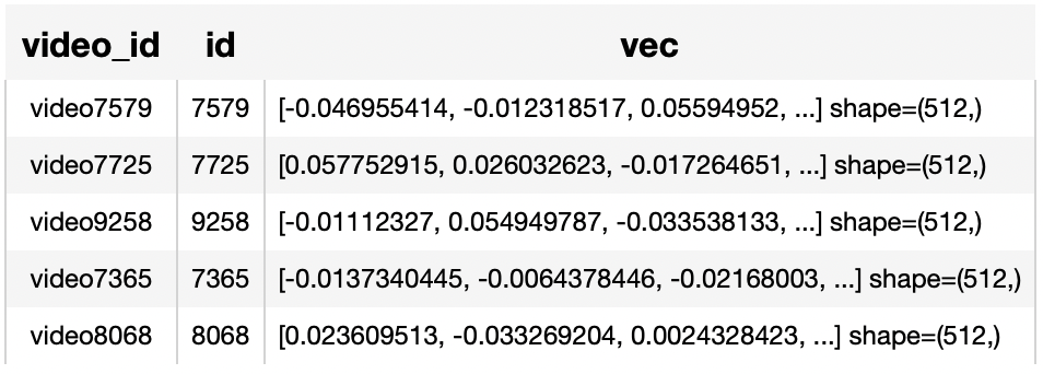 dc.select['video_id', 'id', 'vec']( "'video_id', 'id', 'vec'").show()