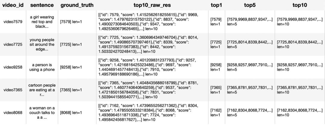 我们已经成功实现了「视频检索」服务的核心功能,接下来可以根据不同指标评估检索引擎。在本节中,我们将使用 recall@topk 评估我们的「视频文本检索」服务的性能: