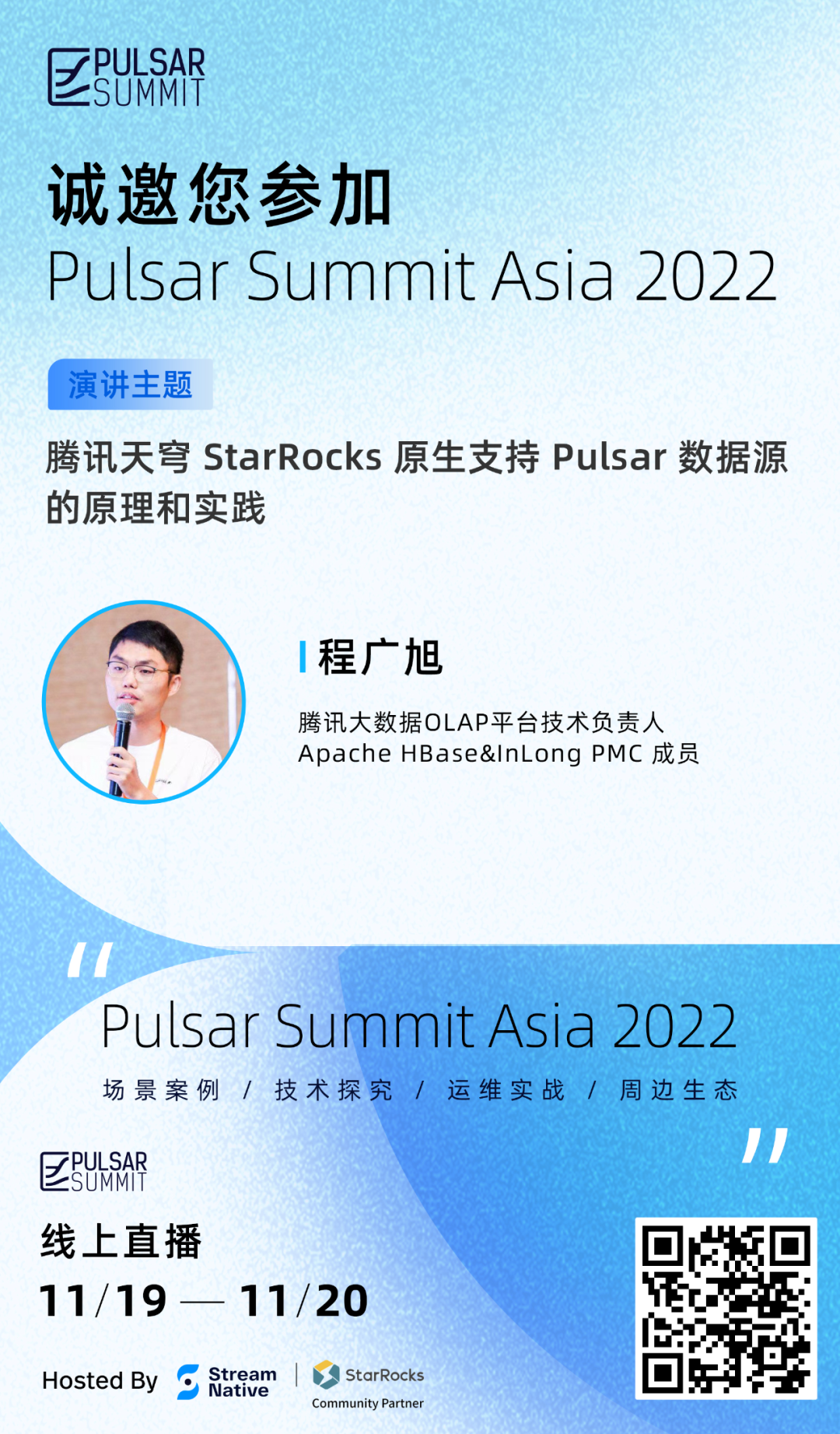 11 月 19 日下午,在由 Apache Pulsar 主办的年度盛会 Pulsar Summit Asia 2022 上,来自腾讯天穹的程广旭老师将代表 StarRocks 社区分享 《腾讯天穹 StarRocks 原生支持 Pulsar 数据源的原理和实践》。如果您对此主题感兴趣,并且希望聆听技术大咖和行业先行者的 Apache Pulsar 实践经验、场景案例、技术探究和运维故事,参与交流探讨 Pulsar 项目最新进展和动态,请马上扫码报名活动!