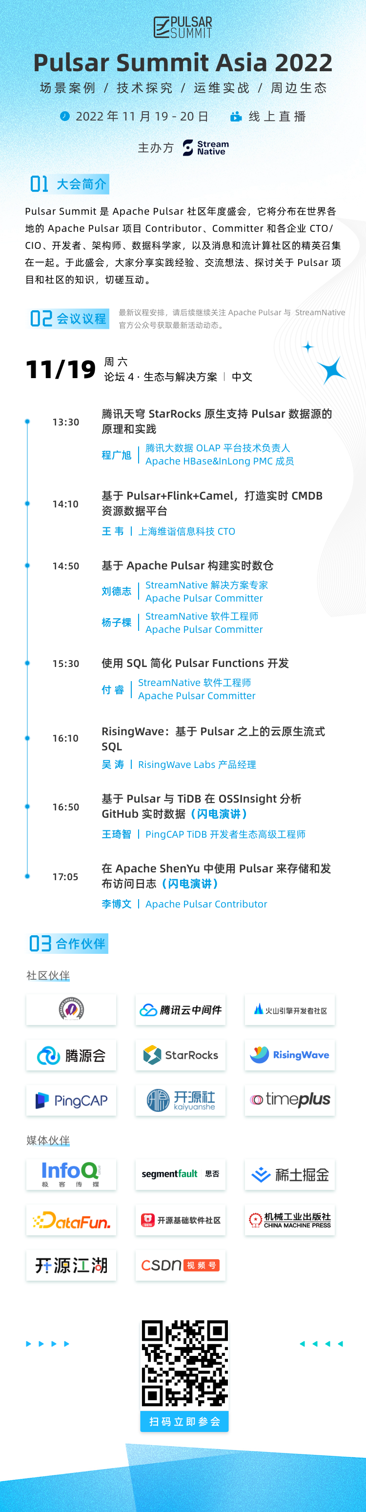 StarRocks 作为 Pulsar Summit Asia 2022 的社区合作伙伴也将同步转播 11/19 号下午的生态 & 解决方案专场。以下是专场的完整议程,精彩内容和大咖讲师不容你错过,欢迎大家扫码报名活动,观看直播还有机会获得限量周边!