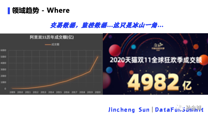 作为在阿里工作近10年的我,对我来说感觉最近的数据是一年一度的双11全球狂欢。我们发现自2009年以来,双11每年的成交额飞速增长,到2020年竟然高达4982亿。这个数字背后,说明了大量数据的产生。但是相对于175ZB的数据来说,这些交易数据,监控数据,只是冰山一角。为什么这样说呢?我们继续往下看。。。