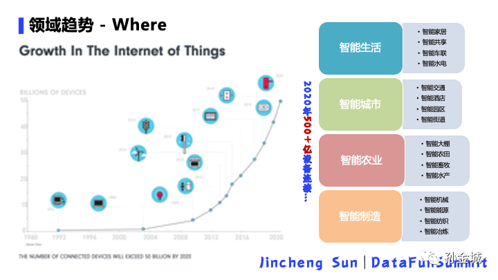 这里同样又一份关于全球设备连接的统计数据,到2020年全球有500亿的设备数据上云,这些设备覆盖了很多实际场景,比如:智能生活,智能城市,智能农业,