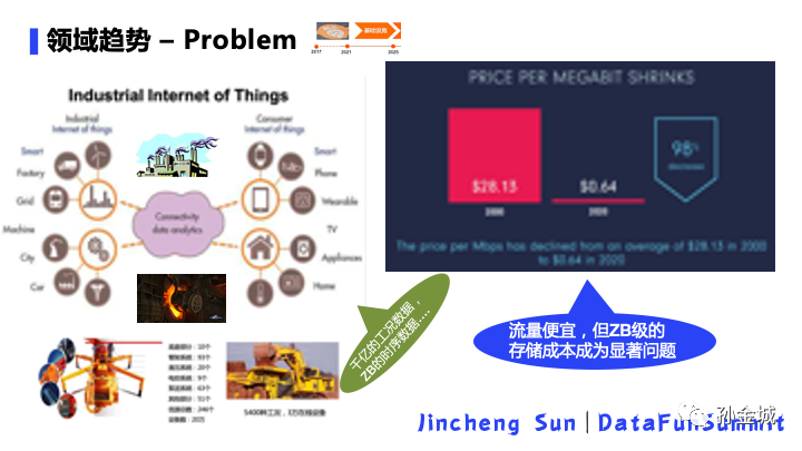 其实,物联网领域的数据产生,大部分来自于 工业物联网,刚才大家看到,物联网领域设备连接在2020年已经超过500亿,我们以一个挖掘机工矿信息来说,一个设备就有5000多的工况指标要采集,数据每秒都在不停的采集,数据量可畏是惊人的,那么在千亿的工矿数据和ZB级别的时序数据面前,我们面临怎样的难题呢?