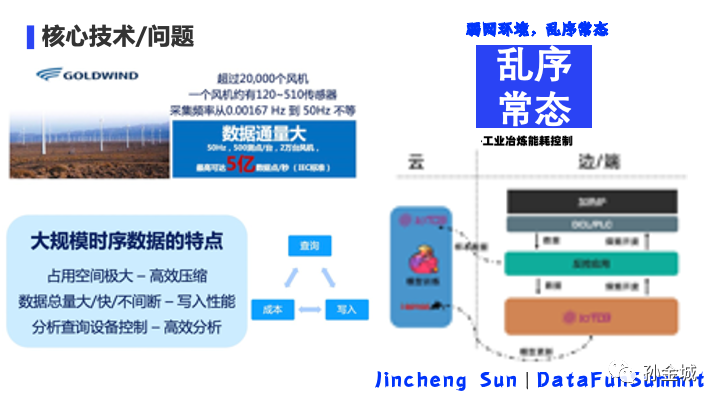 我们前面说最大的数据来源是工业领域的各种设备传感器数据,这些设备的工况数据收集和处理将给存储和计算带来巨大的挑战。我们还是以一个具体的案例来说,这是GoldWind发电数据采集,GoldWind有超过2w个风机,一个风机有120-510个传感器,采集频率高达50Hz,就是每个传感器1秒50个数据点采集峰值。这要算下来就是每秒5亿个时序指标点的数据。这个数据量让数据采集/存储/计算面临很大的挑战。同时还有我们业务中的一些非常常见的查询需求。所以时序数据的存储将要解决写入吞吐问题,还有数据查询分析的性能问题。