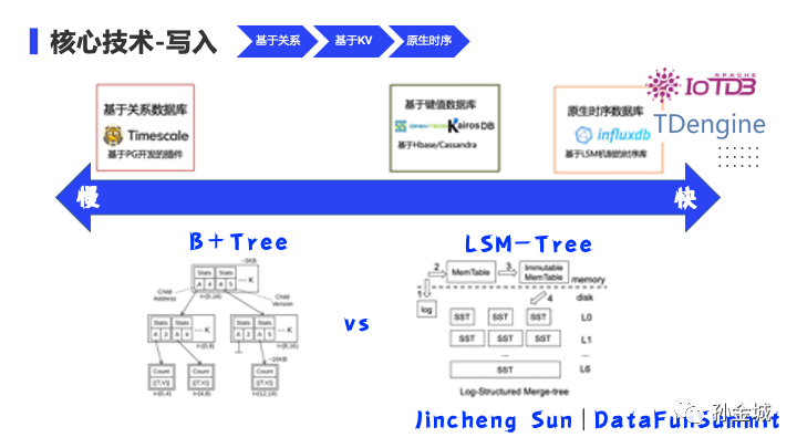 关系数据库的存储写入架构是基于B-Tree或者B+Tree,而KV和原生的时序数据库都是基于LSM-Tree进行数据写入设计的。不同的数据结构对写入性能产生巨大的影响。我们进一步细聊一下其中的原因。。。