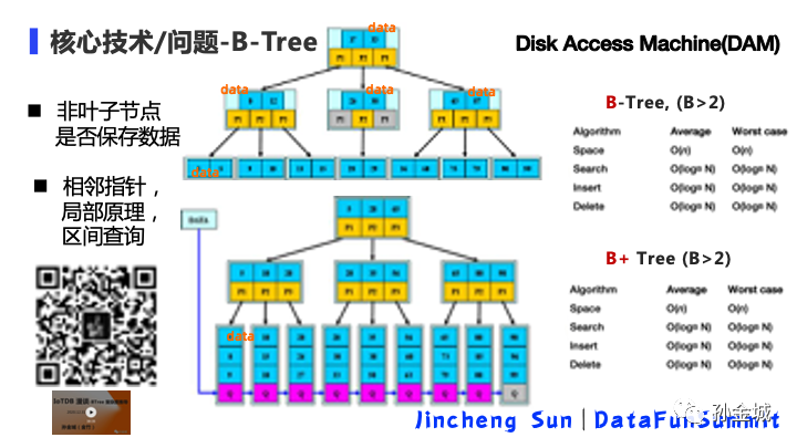 所以我以DAM的维度看两种数据结果的复杂度,我们会发现不论是BTree和B+Tree写入和查询复杂度都是LogBN,B是阶数,N是节点数。感兴趣算法复杂度的推导的朋友可以扫描左下角二维码查看推导过程。那么,既然算法复杂度一样,在实际的存储产品中这两种设计有怎样的区别呢,我们先看看BTree和B+Tree的数据结构设计的区别: