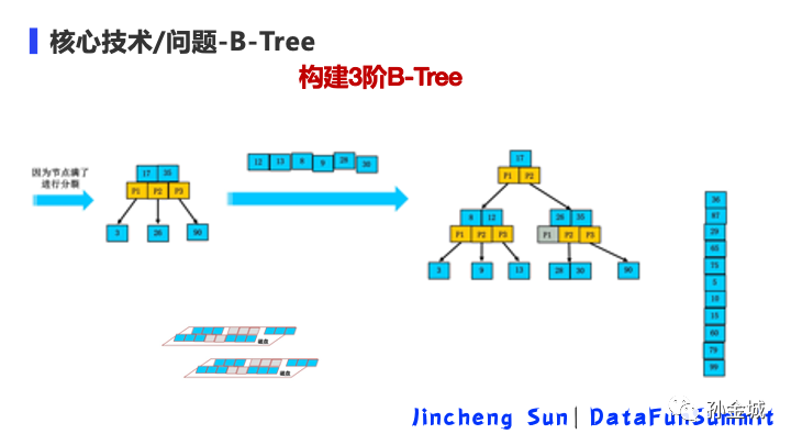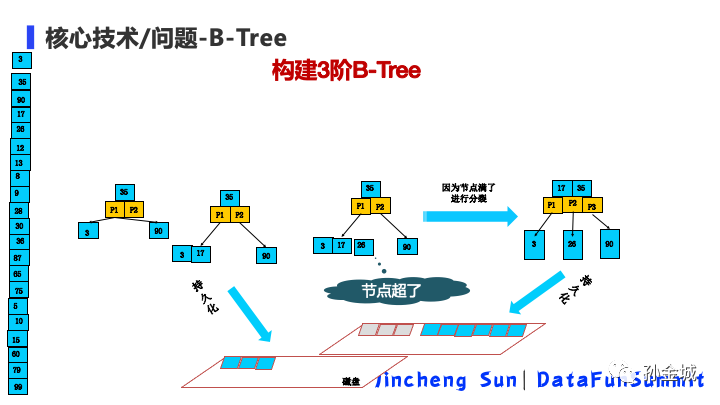 首先数据陆陆续续的到来,35,3,90这个小树是如何变化的。。先来3,再来 35,再来 90,我们构建数据结构,如图,35左右是3和90,数据再陆续到来,当17到来的是,数据如何变化?17比35小,所以17再左子树。假设这时候我进行了一次持久化操作,然后,后续数据陆续到来。。。当26到来的时候,26比35小,在35的左子树,但是35左边已经有2个data了,做3阶Btree,节点超了。因为节点超了,所以我们需要进行节点分裂,如图,17上提与35同一层级。这时候我们假设再次磁盘持久化处理,我们发现3和17已经不在一个数据块了,17和35又重新写到了磁盘上的一个数据块。