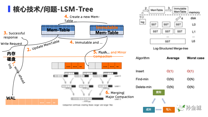那么我们再来看看LSM-Tree的为什么是顺序IO?其实,LSM核心思想是放弃部分读能力,换取写入的最大化能力。我们看到LSM-Tree的写入复杂度是O(1)。具体的插入流程如下: