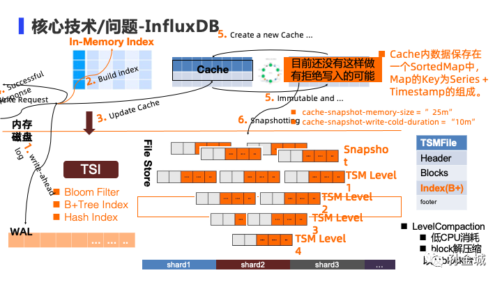 当然,在Mem-Table部分,InfluxDB也做了局部优化,利用hash进行分布优化。同时在持久化时机上面也考虑了内存大小和刷盘时间周期。其实,InfluxDB设计了自己的TSMFile格式,文件增加了索引建立。这里和大家提一句就是,InfluxDB的设计充分考虑时序数据的时间特点,在Mem-Table中的Map中采用timestamp作为key的组成部分。从1.8版本看,InfluxDB代码里面没有看到将内存变成immutable的部分。在InfluxDB的Compaction时候也考虑若干优化因素。比如压缩算法的选择等。最后,InfluxDB还设计了自己的索引结构,TSI极大的加速了数据查询性能。