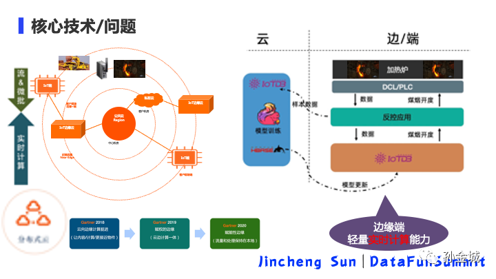 乱序问题问什么是时序数据场景的核心问题呢,我看一个具体的智能制造的案例,如图。是一个工业冶炼能耗控制的例子。核心需求是,在云端进行大量的实时模型训练,然后模型下推到边缘端,在边缘端利用时序数据库进行数据的本地存储和局部数据数据预测,进而控制本地的熔炉燃料投放。比如,5秒钟一个计算窗口,那么乱序造成的计算不精准,将会对能源消耗和冶炼质量带来很大的影响。所以说,乱序问题的解决也是时序数据价值最大化的核心问题所在。