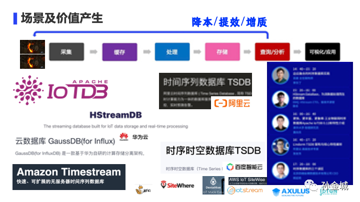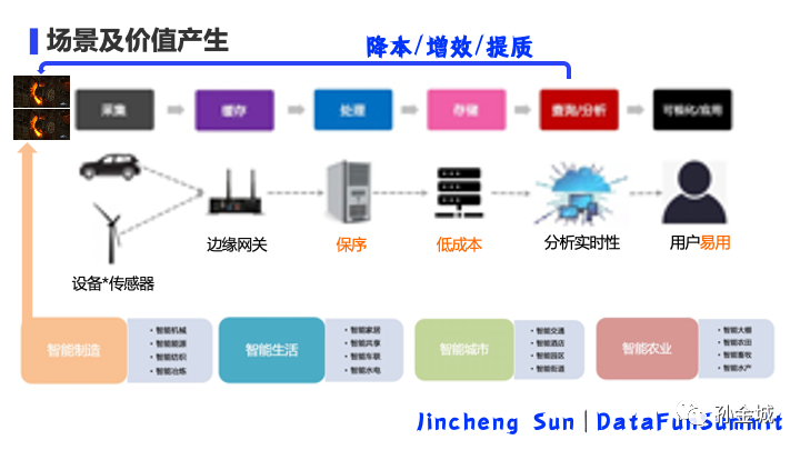 时序数据库可以应用到各种场景中包括前面提各种监控领域,以及前面提到的智能制造,智能生活,智能城市等场景中,那么要想这些场景中的价值最大化,我们需要考虑从采集到数据分析和数据可视化的各个环节的不同挑战性问题。