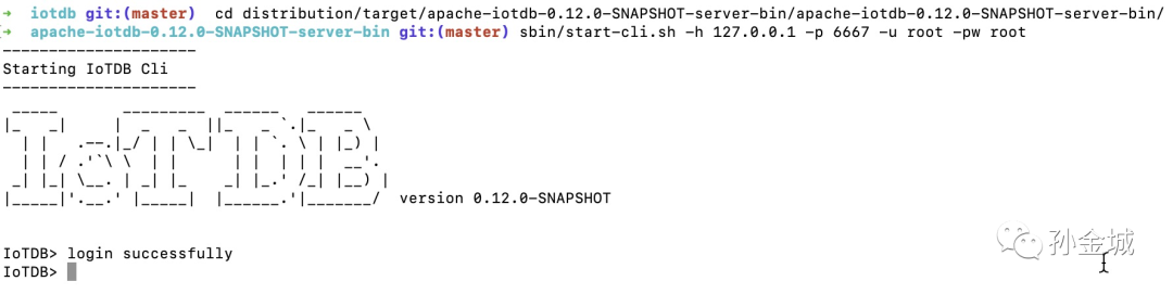➜ iotdb git:(master) cd distribution/target/apache-iotdb-0.12.0-SNAPSHOT-server-bin/apache-iotdb-0.12.0-SNAPSHOT-server-bin/➜ apache-iotdb-0.12.0-SNAPSHOT-server-bin git:(master) sbin/start-cli.sh -h 127.0.0.1 -p 6667 -u root -pw root