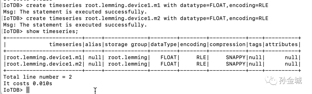 IoTDB> create timeseries root.lemming.device1.m1 with datatype=FLOAT,encoding=RLEIoTDB> create timeseries root.lemming.device1.m2 with datatype=FLOAT,encoding=RLE...IoTDB> show timeseries;