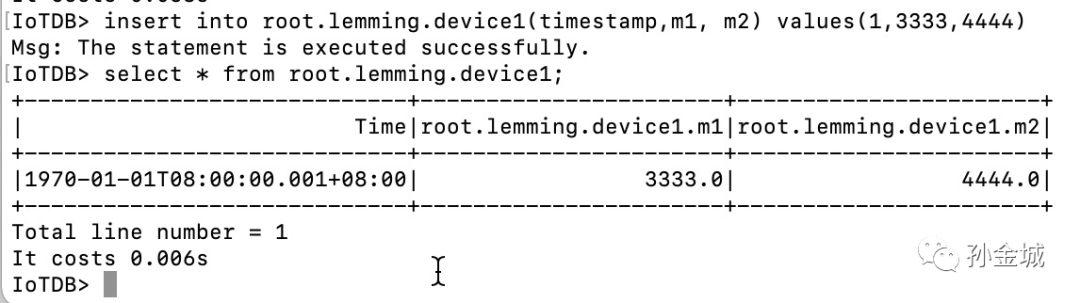 IoTDB> insert into root.lemming.device1(timestamp,m1, m2) values(1,3333,4444)IoTDB> select * from root.lemming.device1;
