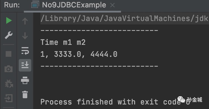 public class No9JDBCExample {/*** 第一次运行 init(),如果一切顺利,正面环境和数据准备完成*/public static void main(String[] args) throws Exception {Class.forName("org.apache.iotdb.jdbc.IoTDBDriver");try (Connection connection =DriverManager.getConnection("jdbc:iotdb://127.0.0.1:6667/", "root", "root");Statement statement = connection.createStatement()) {init(statement);} catch (IoTDBSQLException e) {e.printStackTrace();}}public static void init(Statement statement) throws Exception {setStorageGroup(statement);statement.execute("CREATE TIMESERIES root.lemming.device1.m1 with datatype=FLOAT,encoding=RLE");statement.execute("CREATE TIMESERIES root.lemming.device1.m2 with datatype=FLOAT,encoding=RLE");statement.execute("INSERT INTO root.lemming.device1(timestamp,m1, m2) VALUES (1,3333,4444)");ResultSet resultSet = statement.executeQuery("SELECT timestamp, m1 as m1, m2 as m2 FROM root.lemming.device1");outputResult(resultSet);}public static void setStorageGroup(Statement statement) throws Exception{try {statement.execute("SET STORAGE GROUP TO root.lemming");}catch (Exception e){statement.execute("DELETE STORAGE GROUP root.lemming");statement.execute("SET STORAGE GROUP TO root.lemming");}}private static void outputResult(ResultSet resultSet) throws SQLException {if (resultSet != null) {System.out.println("--------------------------");final ResultSetMetaData metaData = resultSet.getMetaData();final int columnCount = metaData.getColumnCount();for (int i = 0; i < columnCount; i++) {System.out.print(metaData.getColumnLabel(i + 1) + " ");}System.out.println();while (resultSet.next()) {for (int i = 1; ; i++) {System.out.print(resultSet.getString(i));if (i < columnCount) {System.out.print(", ");} else {System.out.println();break;}}}System.out.println("--------------------------\n");}}}