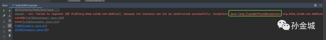 如上代码我们注册了名为 plus的UDF,然后plus(m1, m2)的方式实现了加法需求。当然,我们还不能直接运行udf方法,直接运行会报出找不到rg.khkw.iotdb.no9.AddFunc类,如下: