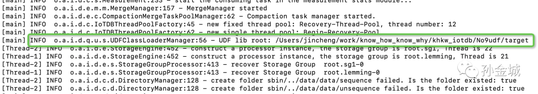 ➜ apache-iotdb-0.12.0-SNAPSHOT-server-bin git:(master) sbin/start-server.sh。。。。。。2021-04-07 08:17:53,398 [main] INFO o.a.i.d.q.u.s.UDFClassLoaderManager:56 - UDF lib root: /Users/jincheng/work/know_how_know_why/khkw_iotdb/No9udf/target。。。2021-04-07 12:34:11,622 [main] INFO o.a.i.d.s.t.ThriftService:125 - IoTDB: start RPC ServerService successfully, listening on ip 0.0.0.0 port 6667