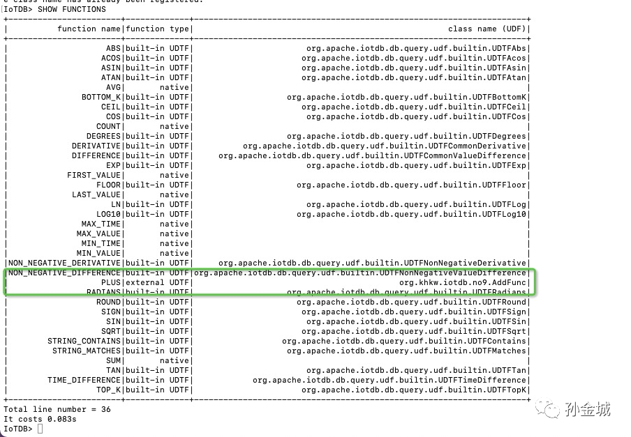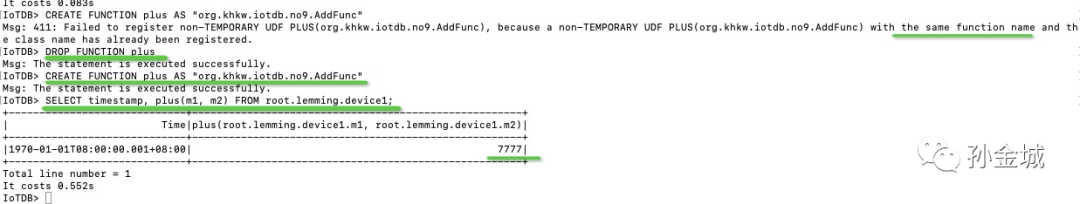 IoTDB> CREATE FUNCTION plus AS "org.khkw.iotdb.no9.AddFunc"Msg: 411: Failed to register non-TEMPORARY UDF PLUS(org.khkw.iotdb.no9.AddFunc), because a non-TEMPORARY UDF PLUS(org.khkw.iotdb.no9.AddFunc) with the same function name and the class name has already been registered.IoTDB> DROP FUNCTION plusMsg: The statement is executed successfully.IoTDB> CREATE FUNCTION plus AS "org.khkw.iotdb.no9.AddFunc"Msg: The statement is executed successfully.IoTDB> SELECT timestamp, plus(m1, m2) FROM root.lemming.device1;+-----------------------------+------------------------------------------------------+| Time|plus(root.lemming.device1.m1, root.lemming.device1.m2)|+-----------------------------+------------------------------------------------------+|1970-01-01T08:00:00.001+08:00| 7777|+-----------------------------+------------------------------------------------------+Total line number = 1It costs 0.552s
