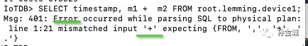 看到这里,不知道大家是否发现,IoTDB虽然在存储层面是按时间序列进行列存储的,但是在API层面已经为大家抽象好来二维表结构,大家可以把多个时间序列当成一张二维度表的不同列,这个抽象大家就免去来入在InfluxDB中利用PIVOT进行行转列的需求,这样就更方便理解和对多时序数据的进行查询分析。好,那么下面我们看看如果实现 m1 + m2 这个需求。