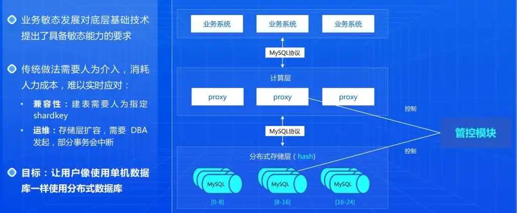 为了应对这种敏态场景,传统做法是人工介入,比如在建表的时候,需要人为指定一个shardkey做分表,但是一般这种方法SQL语法未必能够兼容所有数据库,另外也需要用户自己去预判数据热点,不是很灵活。同时还有一点,比如需要扩容的时候,一些普通的场景需要DBA(数据库运维工程师)发起,可能会中断这个业务的执行。人工扩容没有办法及时处理。