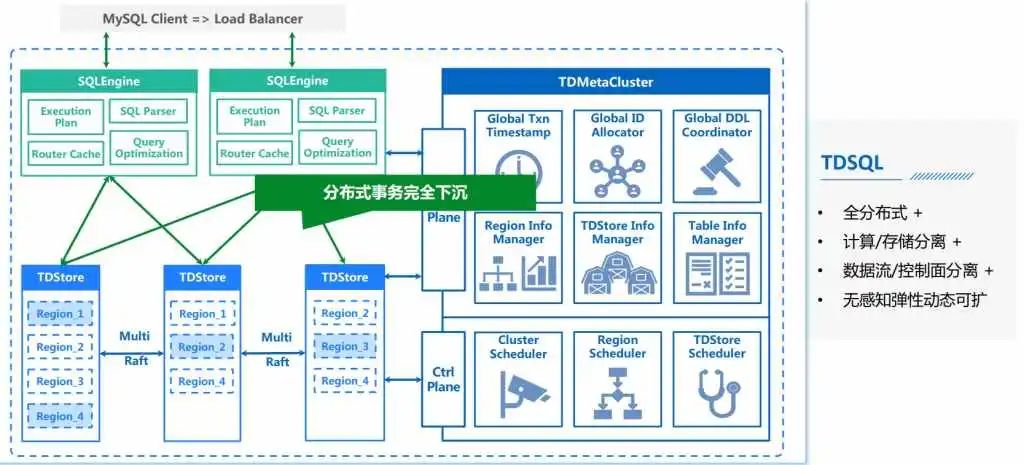 下面这个是TDStore,它是一个Share Nothing存储的分布式集群,它是一个KV的存储模块,用来接收Engine下发的一些KV请求,可以看到TDStore做了一个数据分片,把整个范围的数据划分成各个连续的Region,每一个Region其实是一个独立的Raft pool,它的Raft pool每一个副本是打散在不同的TDStore上,这样我们就实现了一个初步的负载均衡。TDStore同时提供了一个分布式事务的下沉,使用2副本保证一个分布式事务提交的原子性。