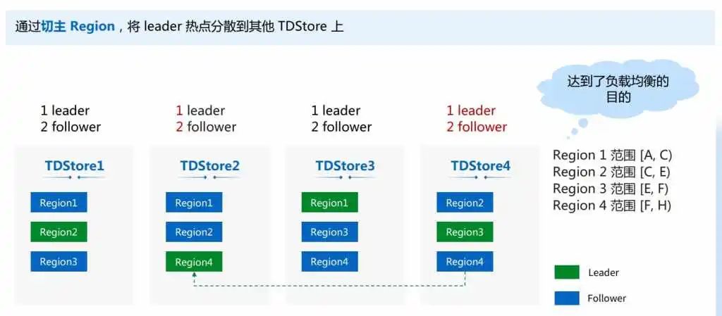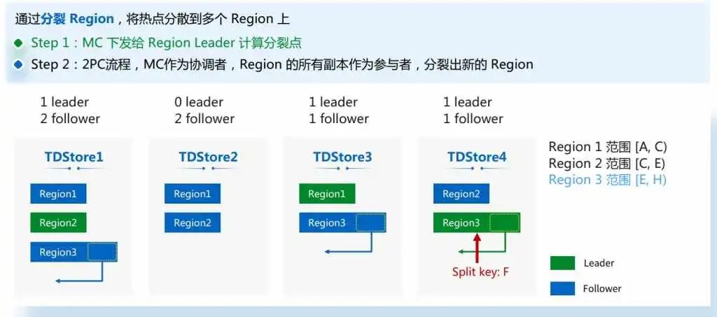 回到刚刚的例子,首先当我们要触发分裂的时候,MC会向Region的Leader下发一个计算分裂点,Leader收到以后会通过二分法找到整个Region范围内的数据中间点Key,把这个Key返回给MC,MC收到以后会重新向每一个Region副本下发分裂任务,当TDSQL收到分裂任务以后,它会在TDSQL上产生一个Region 4,相当于Region 3的数据范围变小了,把它的后半部分Region范围单独拆分出一个新的Region 4,这样来看虽然Region的热点没有了,但是从TDSQL压力来看,没有太大变化,比如说TDSQL 4,现在它变成了有两个Leader,一个副本的节点,而TDSQL更是承担了4个副本的压力,所以我们下一步的目的就是把TDSQL1和TDSQL4的压力均衡到TDSQL2上。