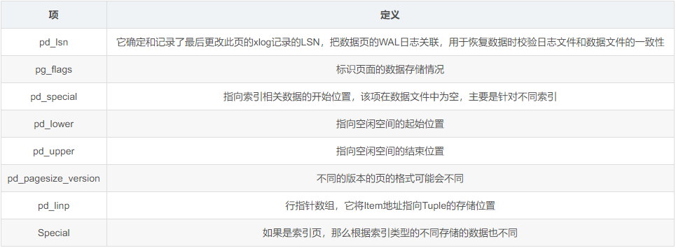 pd_lower,pd_upper: pd_lower指向line pointer的尾部,pd_upper指向最新heap tuple的开头