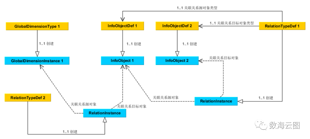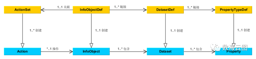 一个对象类型定义(InfoObjectDef)可以和不限数量的属性集定义(DatasetDef)相关联,这些关联定义了一个对象类型中所能表述的所有不同业务类型的属性的集合。