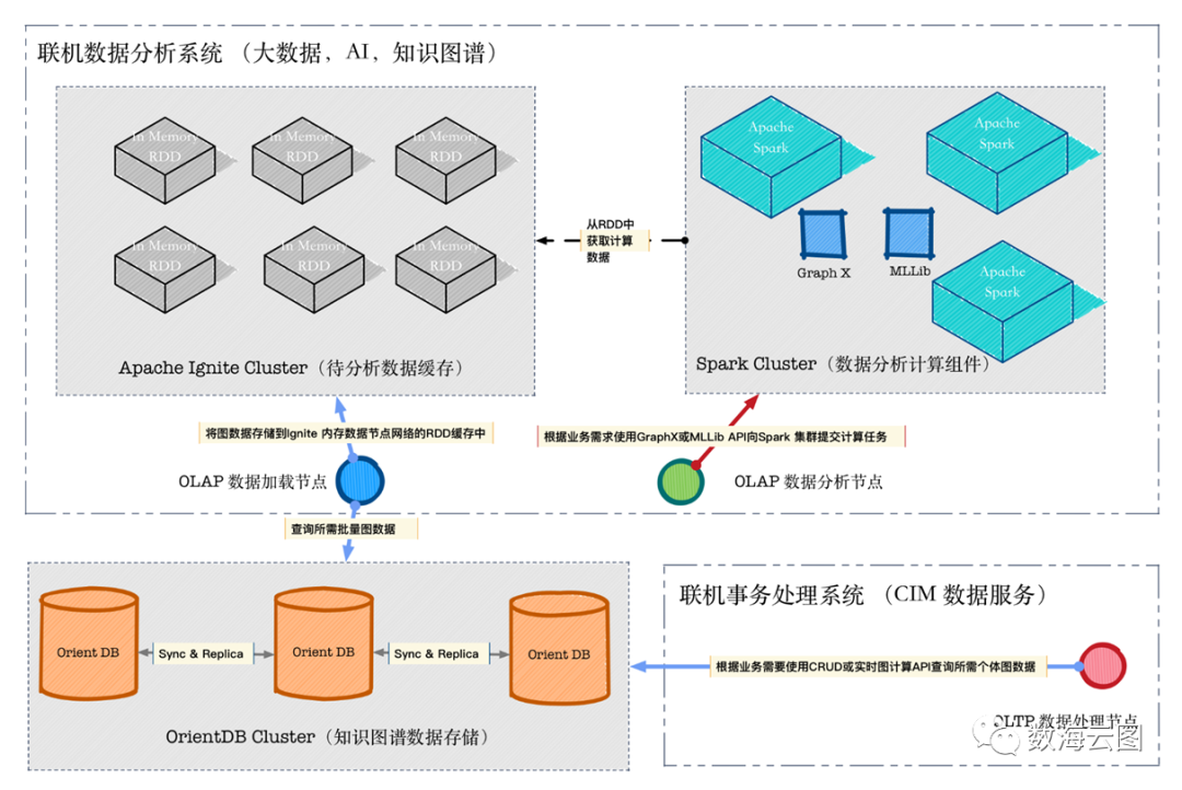 下图描述了结合使用图数据库上的知识图谱与大数据及AI技术的一种技术架构设计:
