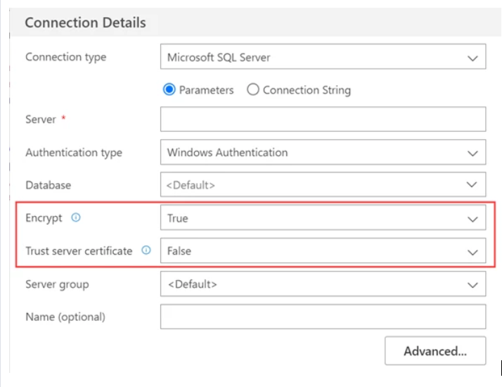 在 Azure Data Studio 1.39 及更低版本中,加密连接属性位于高级页面上,默认为 False。如下所示,加密和信任服务器证书都已移至 Microsoft SQL Server 连接的主要连接详细信息,并带有信息图标以在悬停时提供更多详细信息。