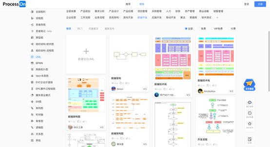ProcessOn 是一个在线协作绘图平台,支持在线制作思维导图、流程图、组织结构图、网络拓扑图、鱼骨图、UML图等。不过其免费版只支持添加 9 张图。所以这里主要推荐其丰富的模版市场,可以通过分类、关键字搜索来查找合适的模版::