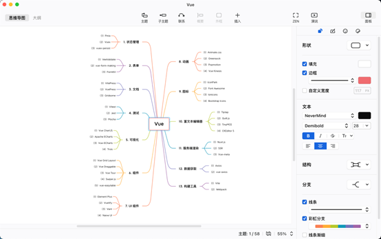 XMind 是一个跨平台的思维导图软件,具有多种结构样式,除了普通的思维导图,还包括树形图、逻辑图、鱼骨图、时间轴、树状表格等等,不同的结构样式可以自由组合混用,同时支持一键更换结构样式。