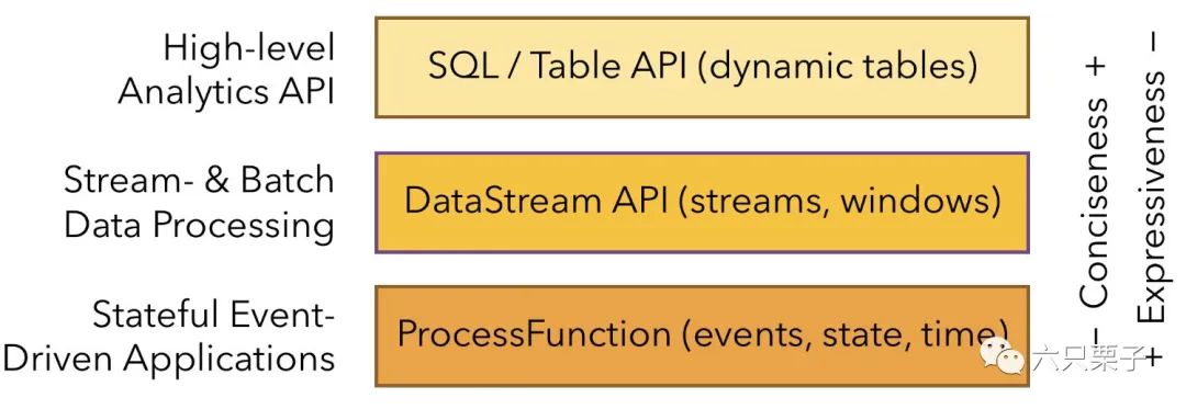 Tabel API:是一种类SQL的API,通过Table API,用户可以像操作表一样操作数据,逻辑上非常直观和方便; SQL:作为一种声明式语言,有着标准的语法和规范,用户可以不用关心底层实现即可进行数据的处理,非常易于上手。